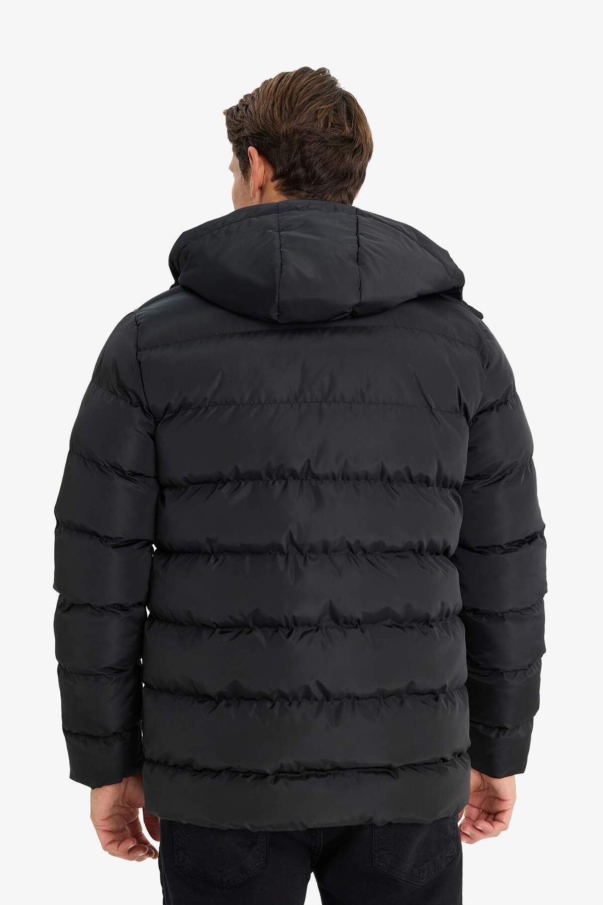 این کاپشن پفی زیپدار کلاهدار سایز معمولی با بسته شدن با دکمه و جیب، هم استایل و هم گرما را در هوای سرد ارائه میدهد.