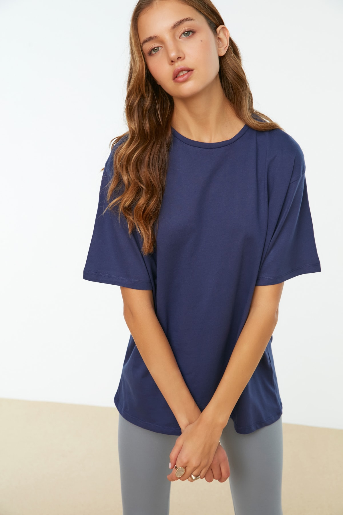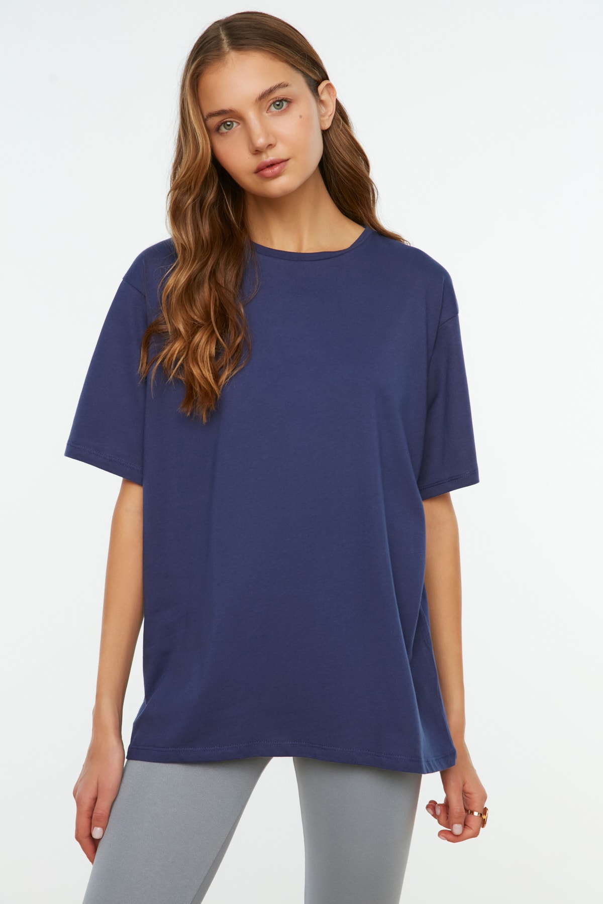 تیشرت زنانه 100% پنبه ای آبی دریایی TRENDYOLMILLA