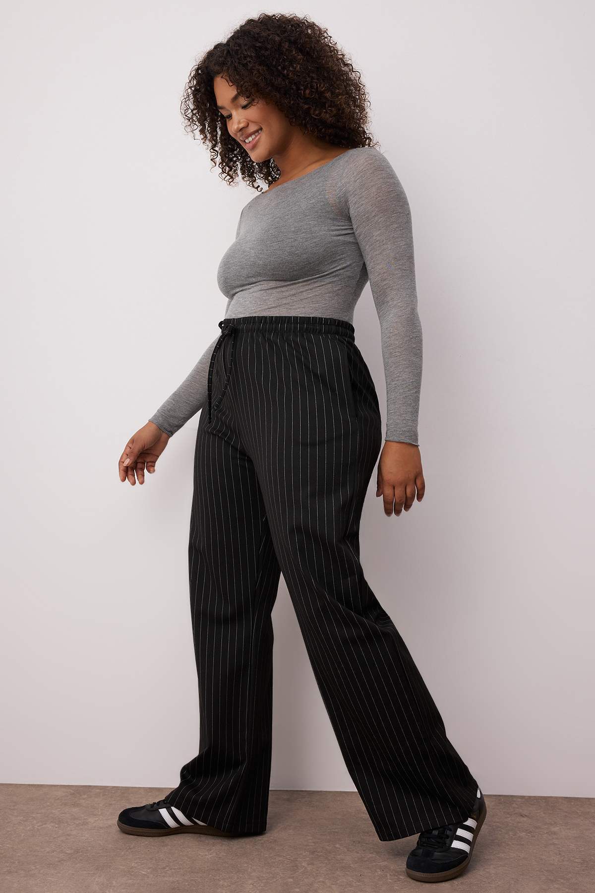 صفحه اصلی\همه شلوار ها\شلوار زنانه انعطافپذیر راهراه ضخیم مشکی، برش مستقیم، سایز بزرگ trendyolmilla