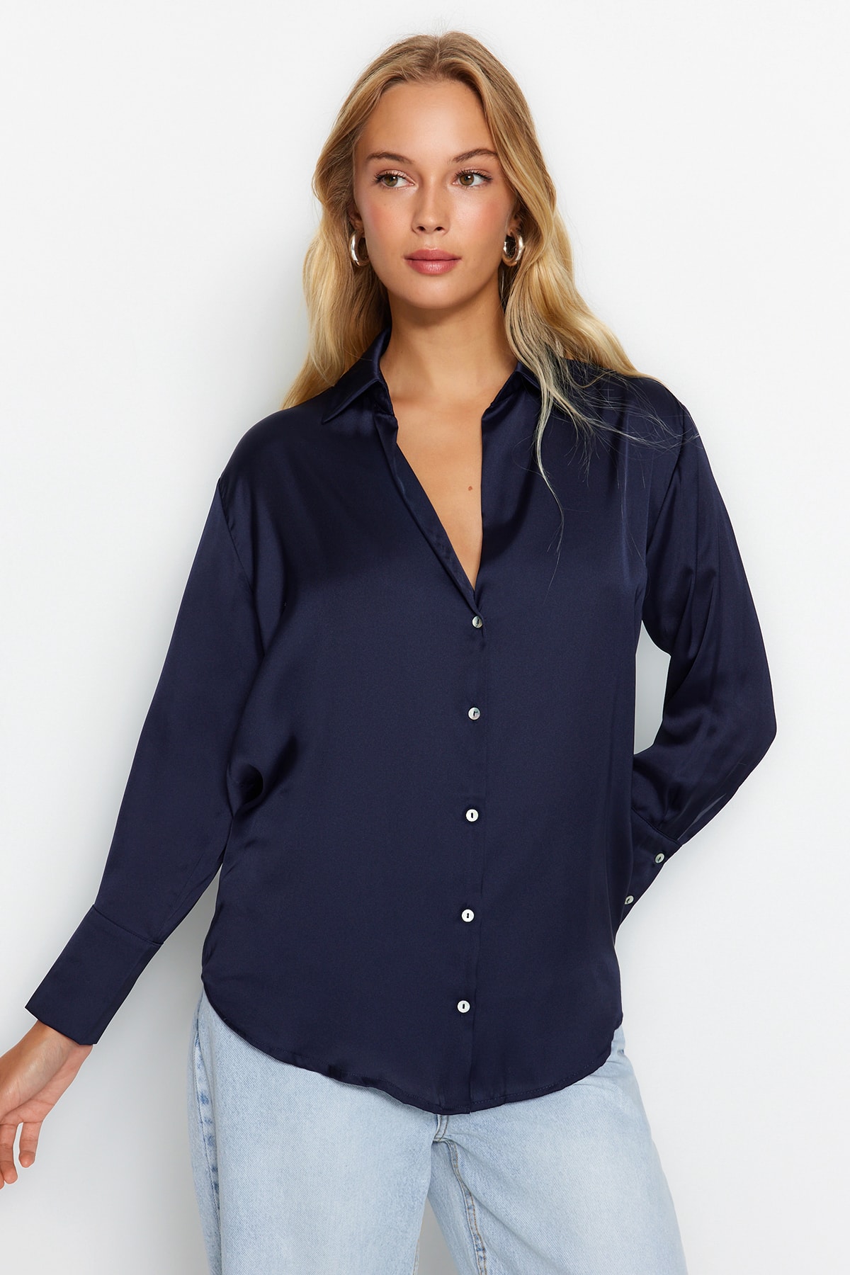 پیراهن زنانه ساتن اور سایز آبی سرمه ای TRENDYOLMILLA