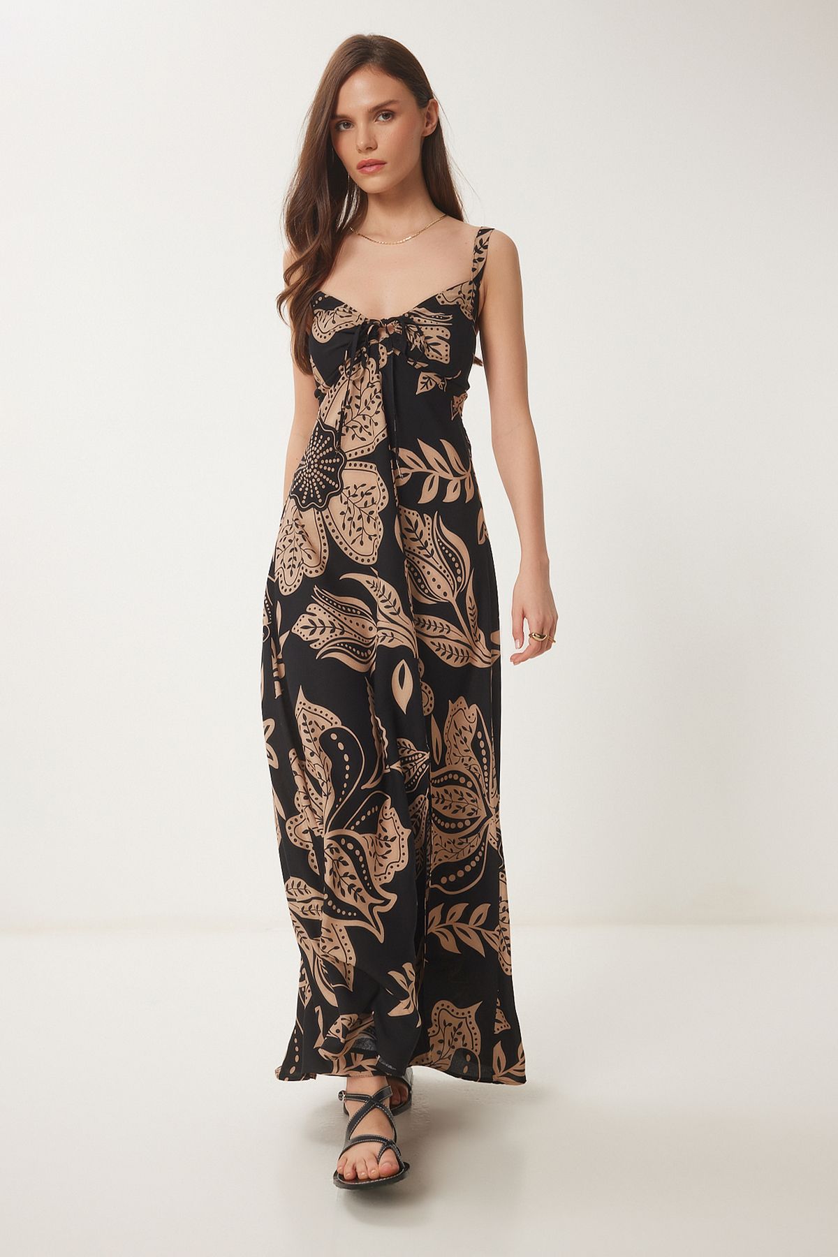 لباس زنانه تابستانی طرح دار مشکی بژ ویسکوز میدی Happiness Istanbul