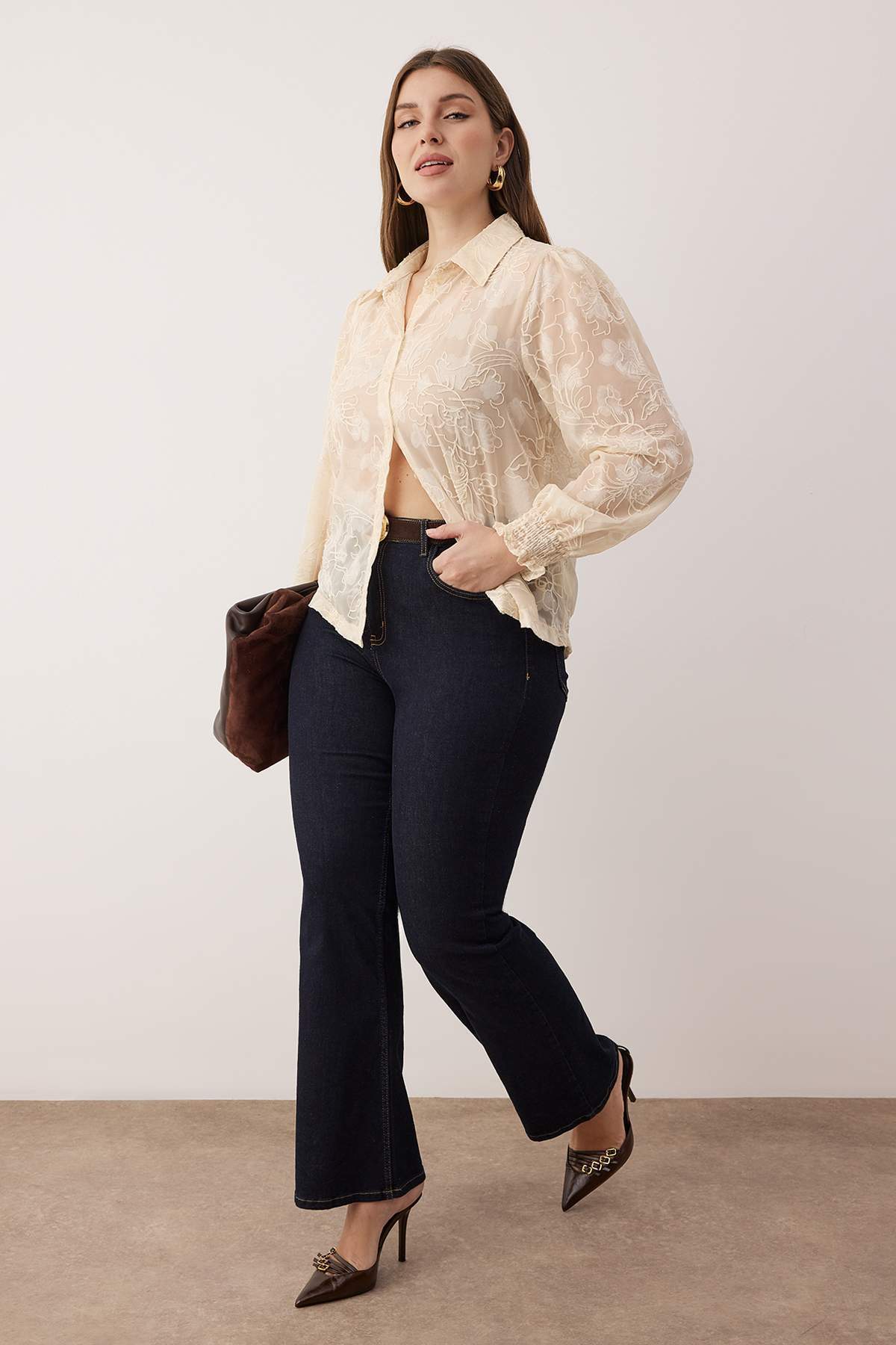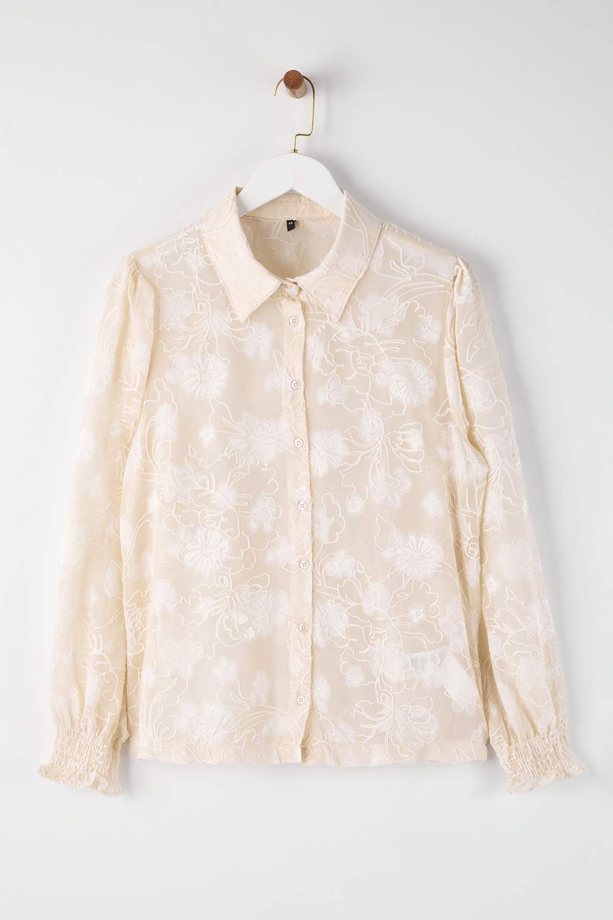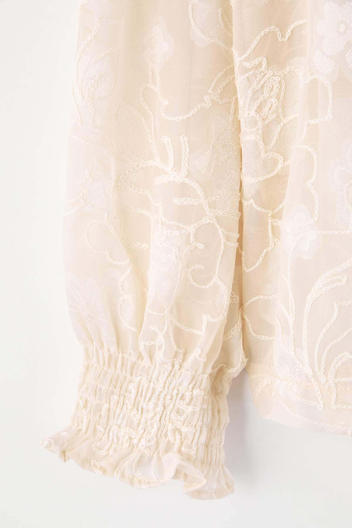 پیراهن زنانه شفاف سایز بزرگ، لبه آستین گلدار رنگ اکرو trendyolmilla