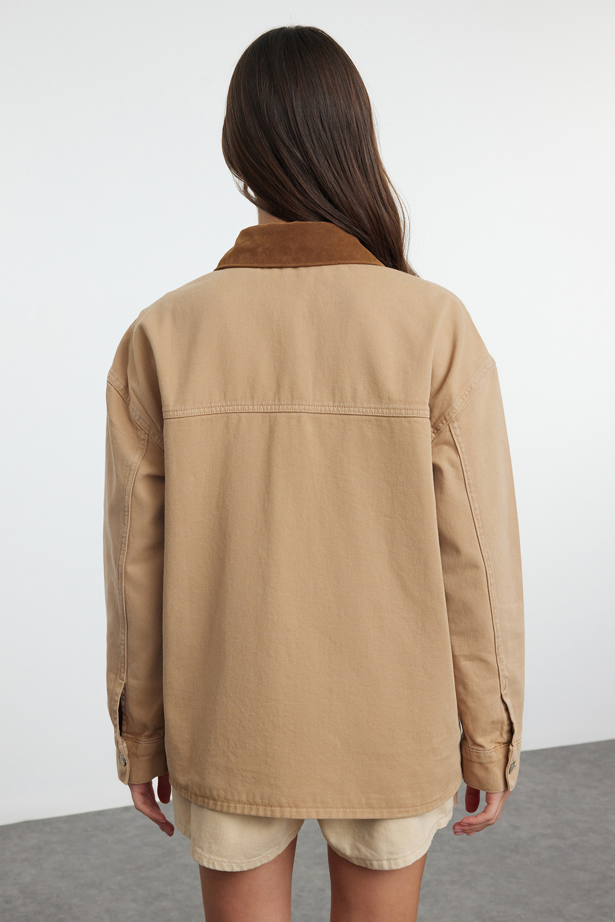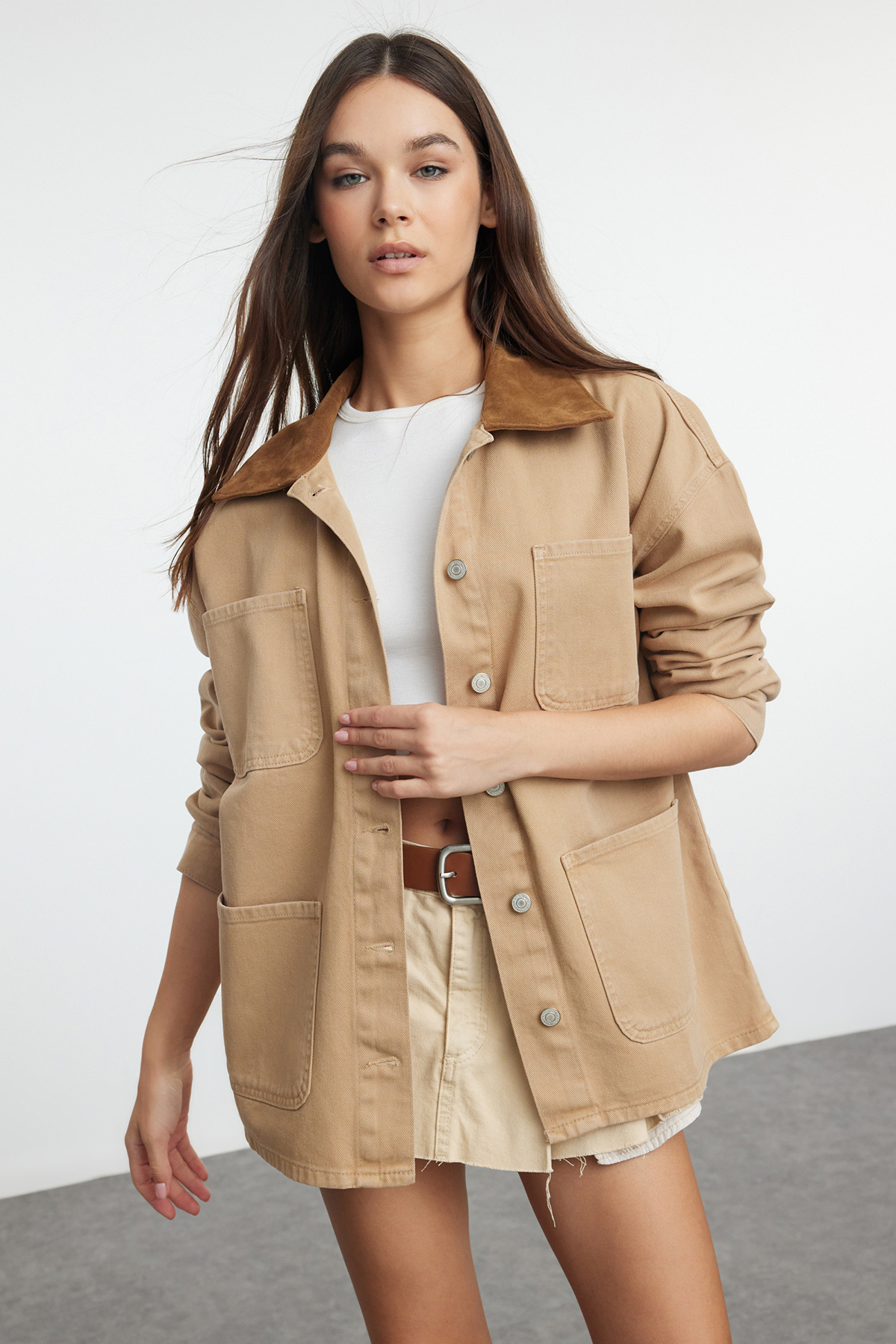کت زنانه جین قهوه ای یقه جیر TRENDYOLMILLA