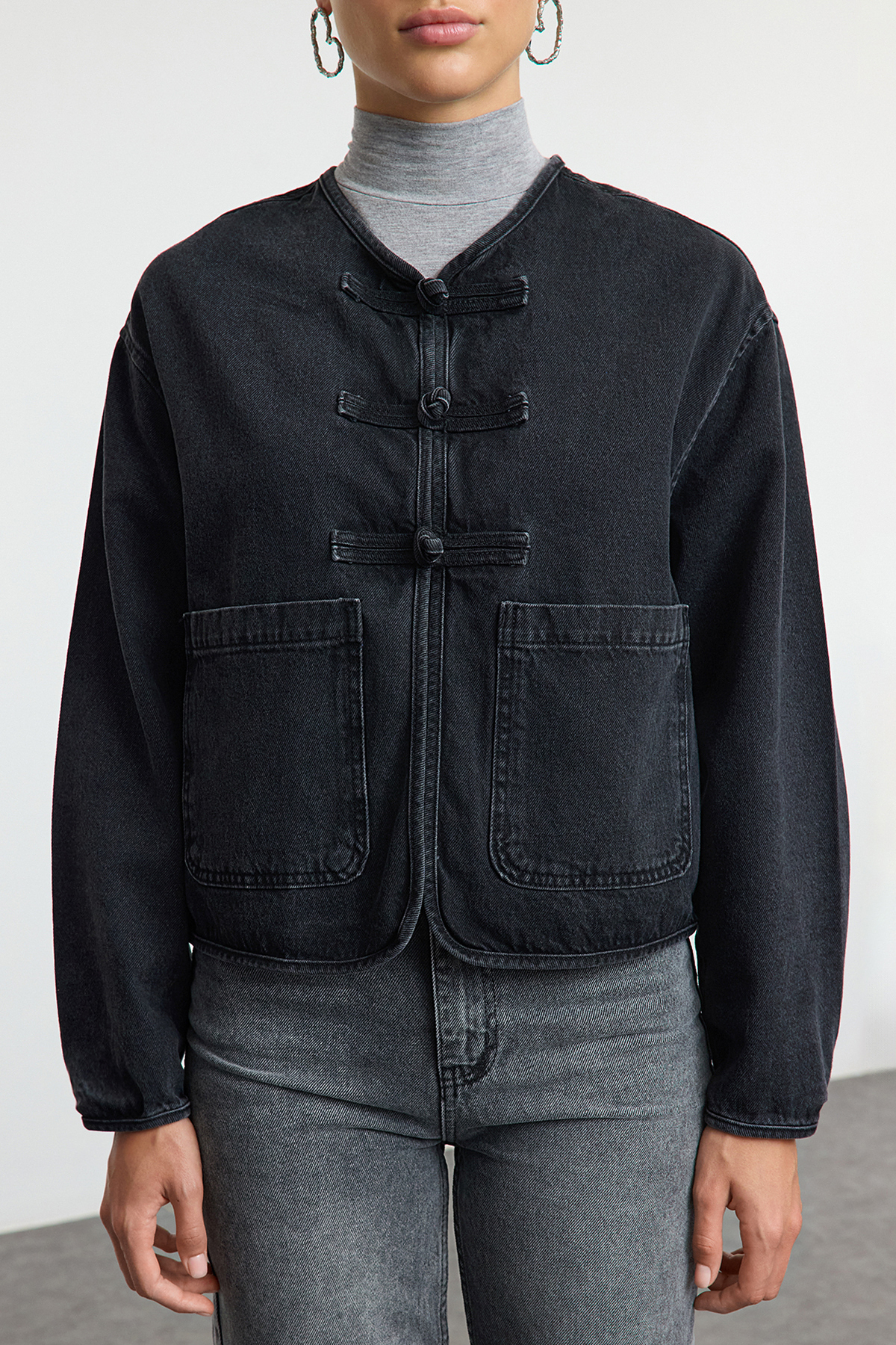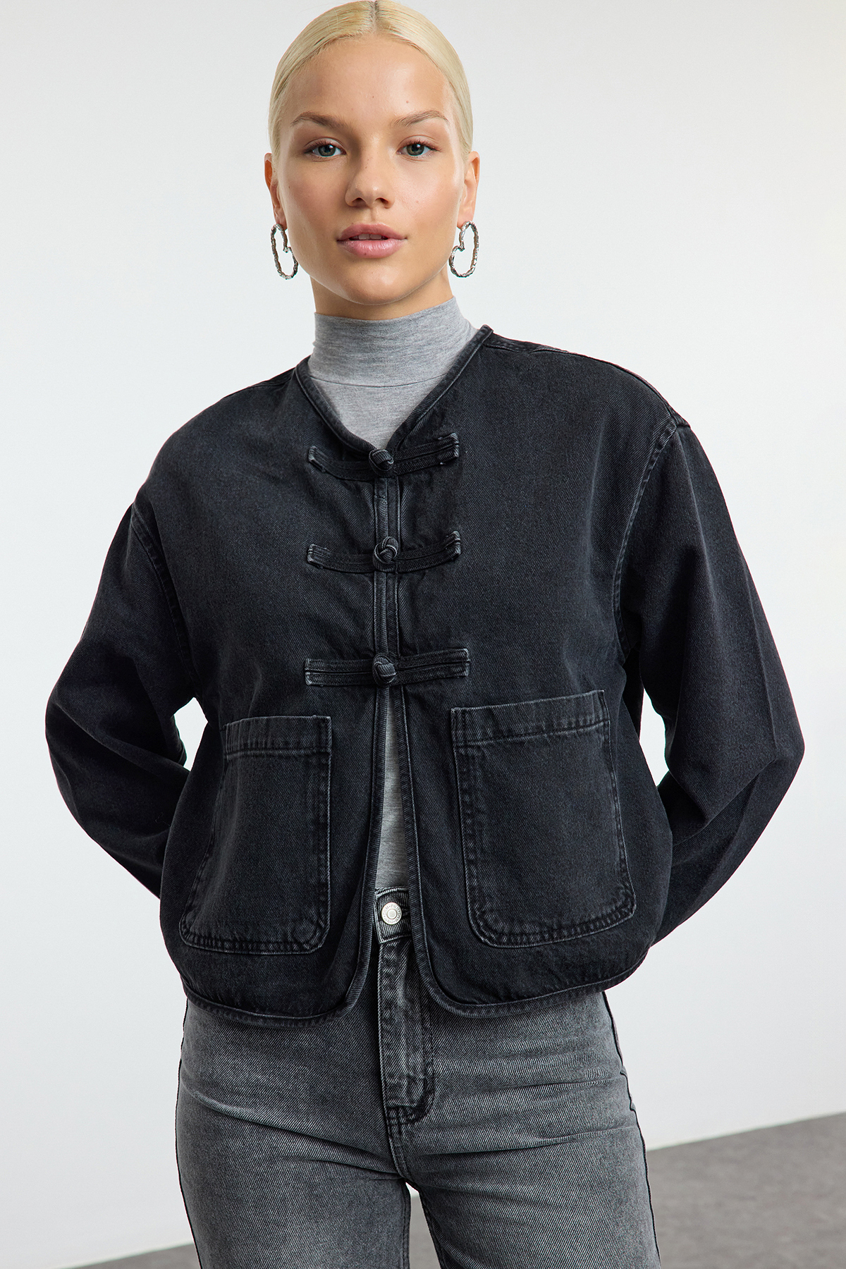 صفحه اصلی\همه کت ها\کت زنانه جین اور سایز با کراوات مشکی TRENDYOLMILLA