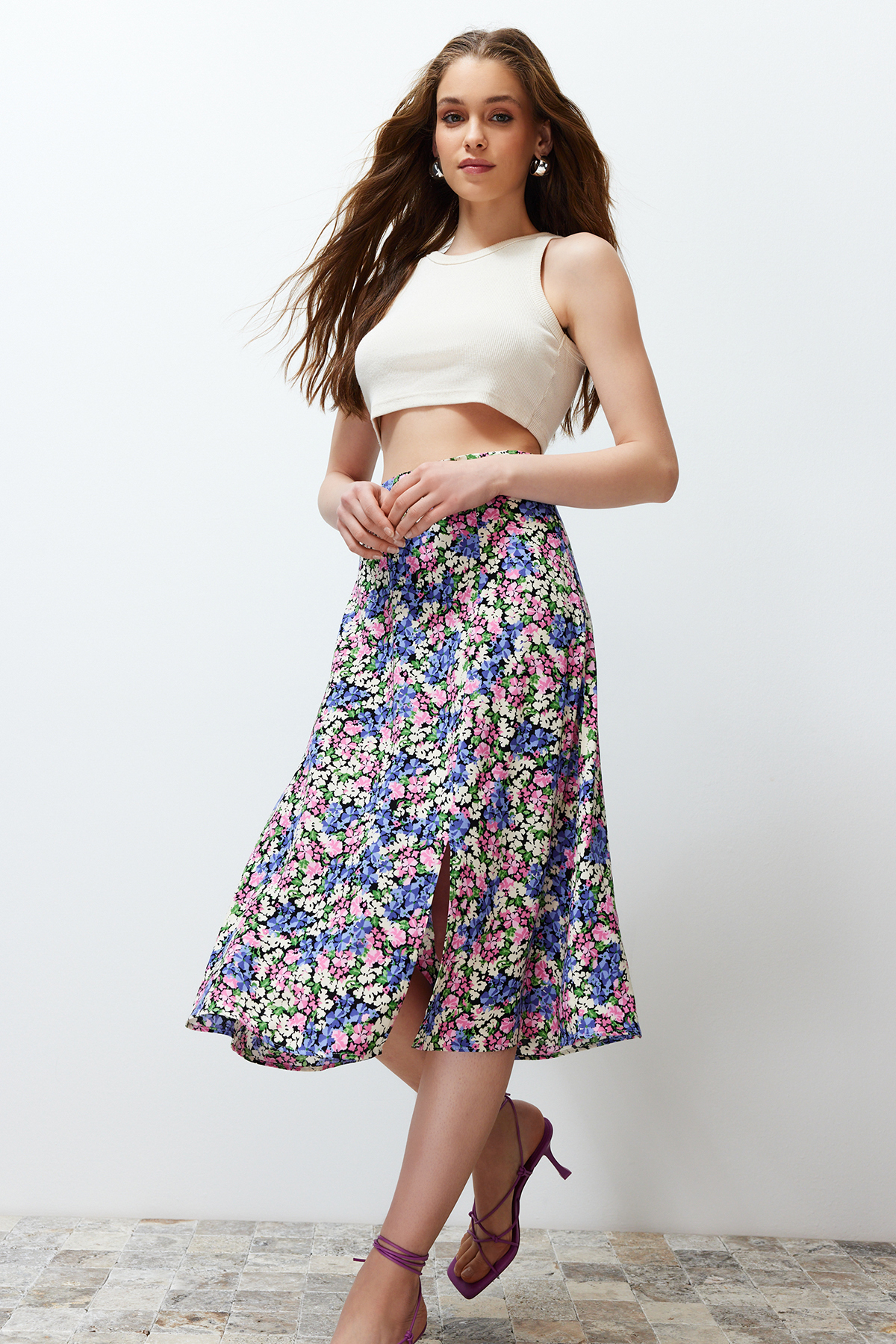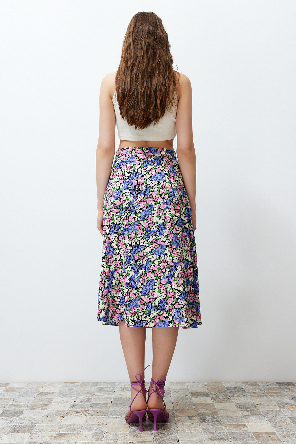 دامن زنانه میدی طرح دار پارچه ویسکوز آبی روشن TRENDYOLMILLA