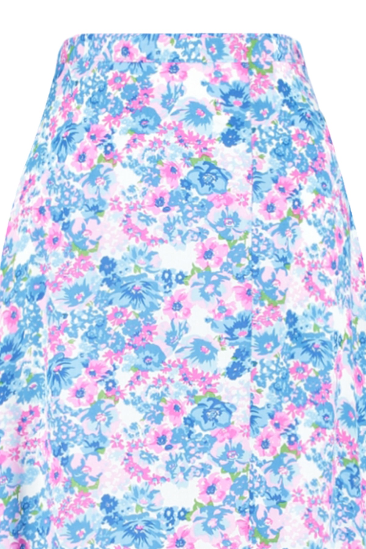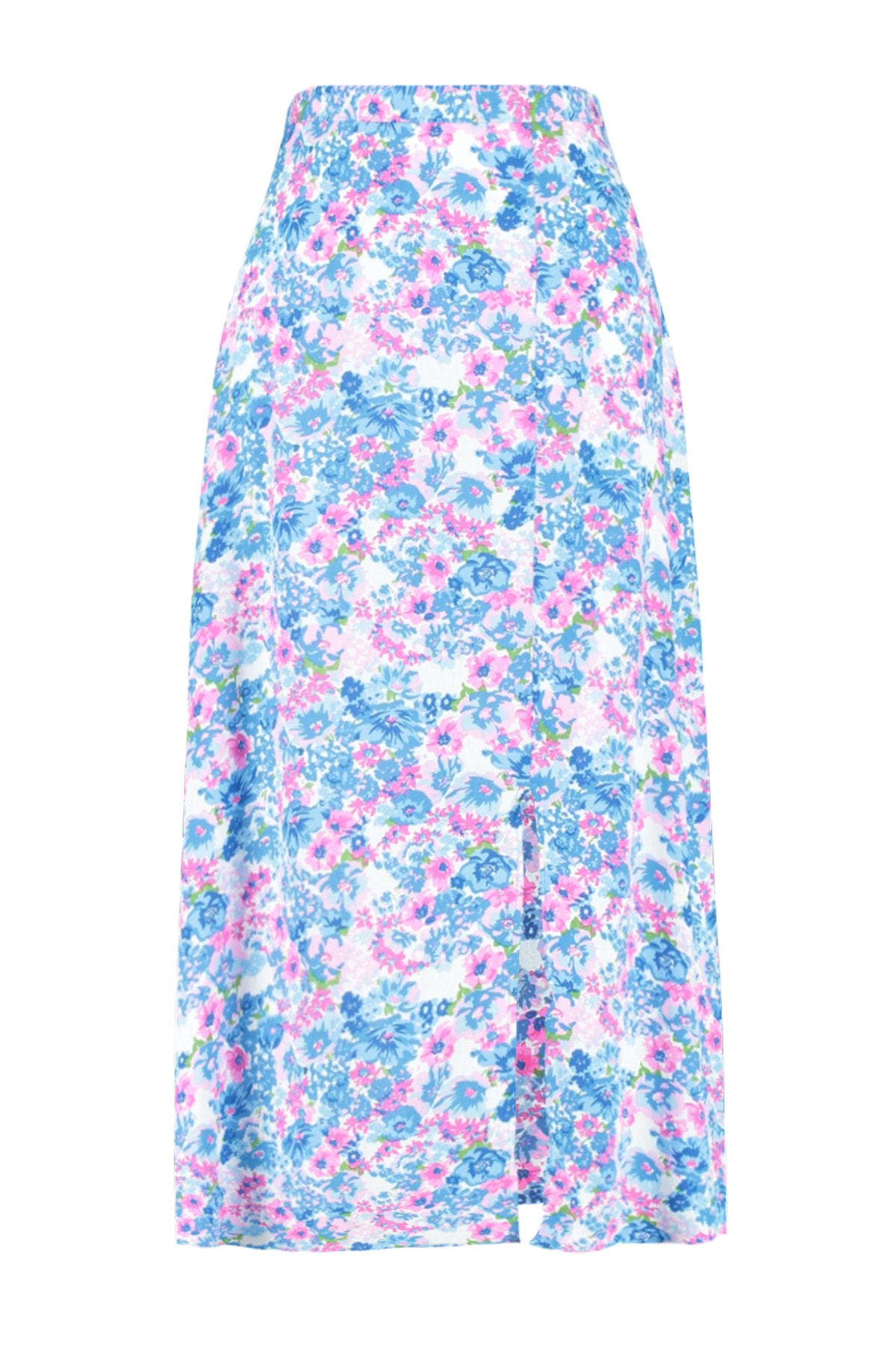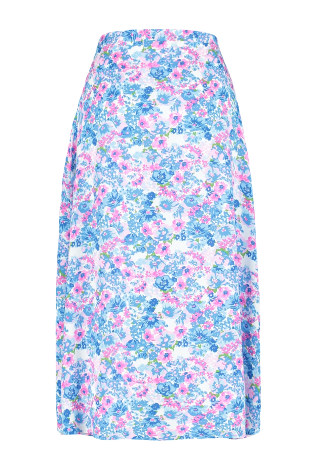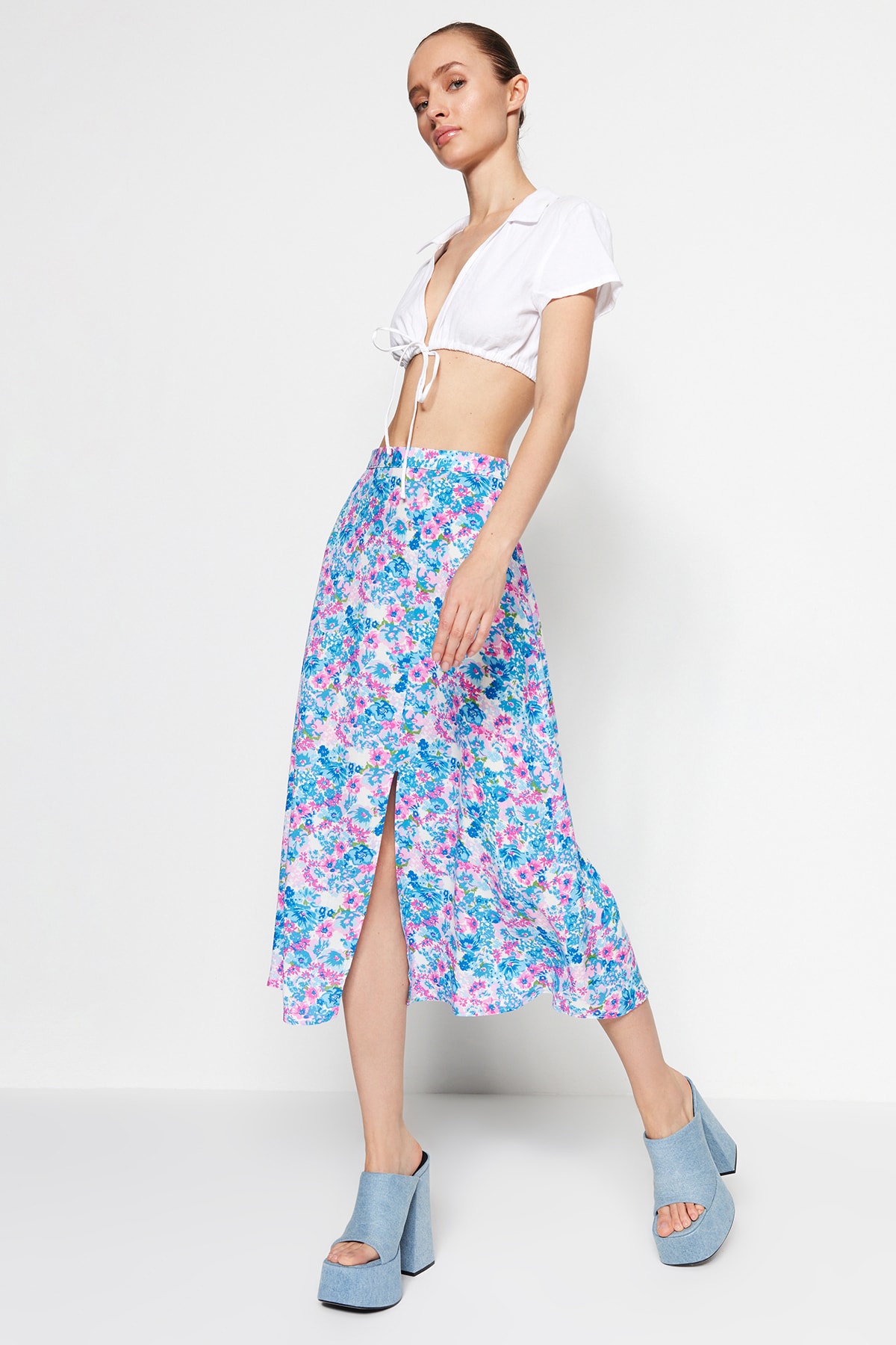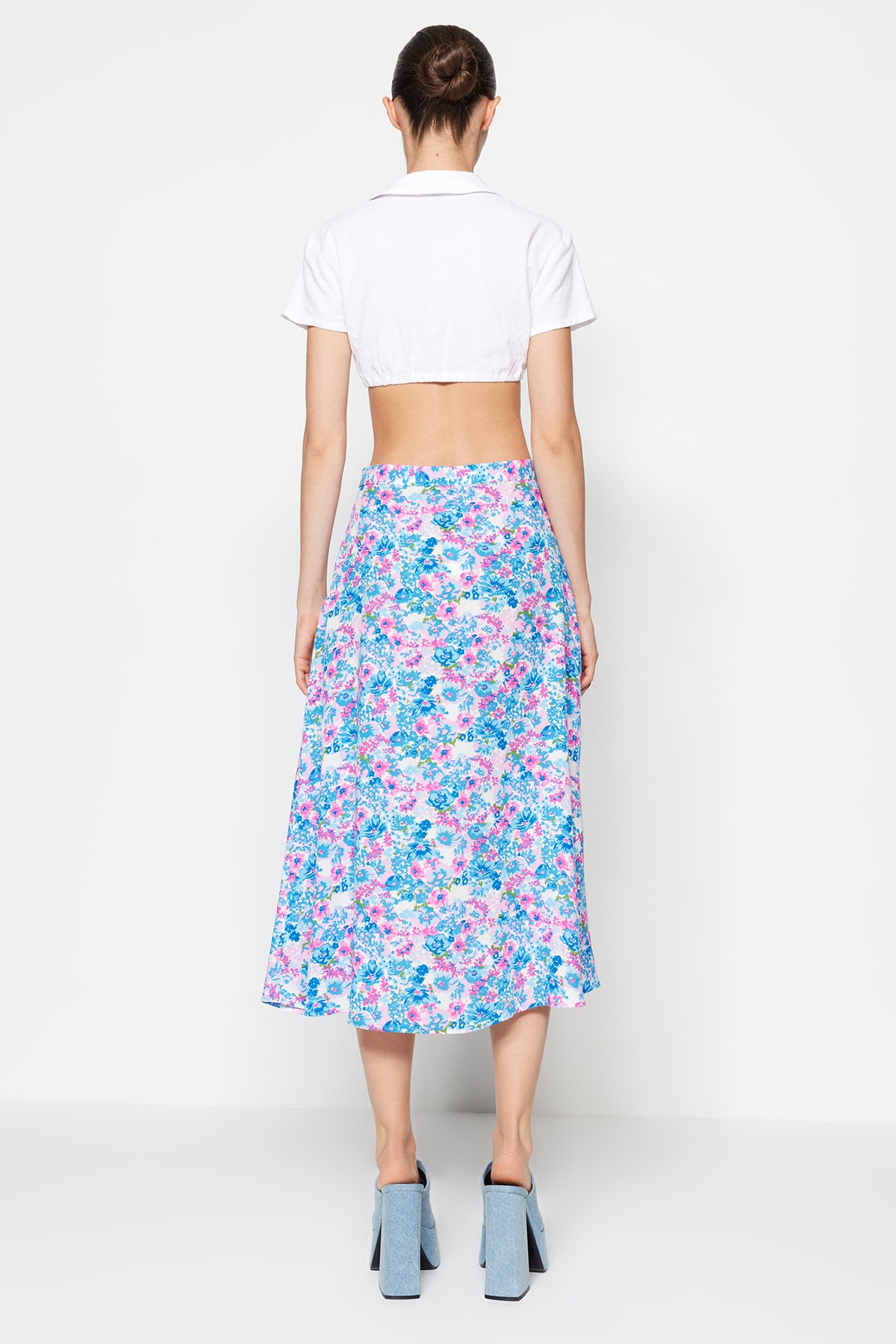 دامن زنانه میدی پارچه ویسکوز طرح دار گل نیلی TRENDYOLMILLA