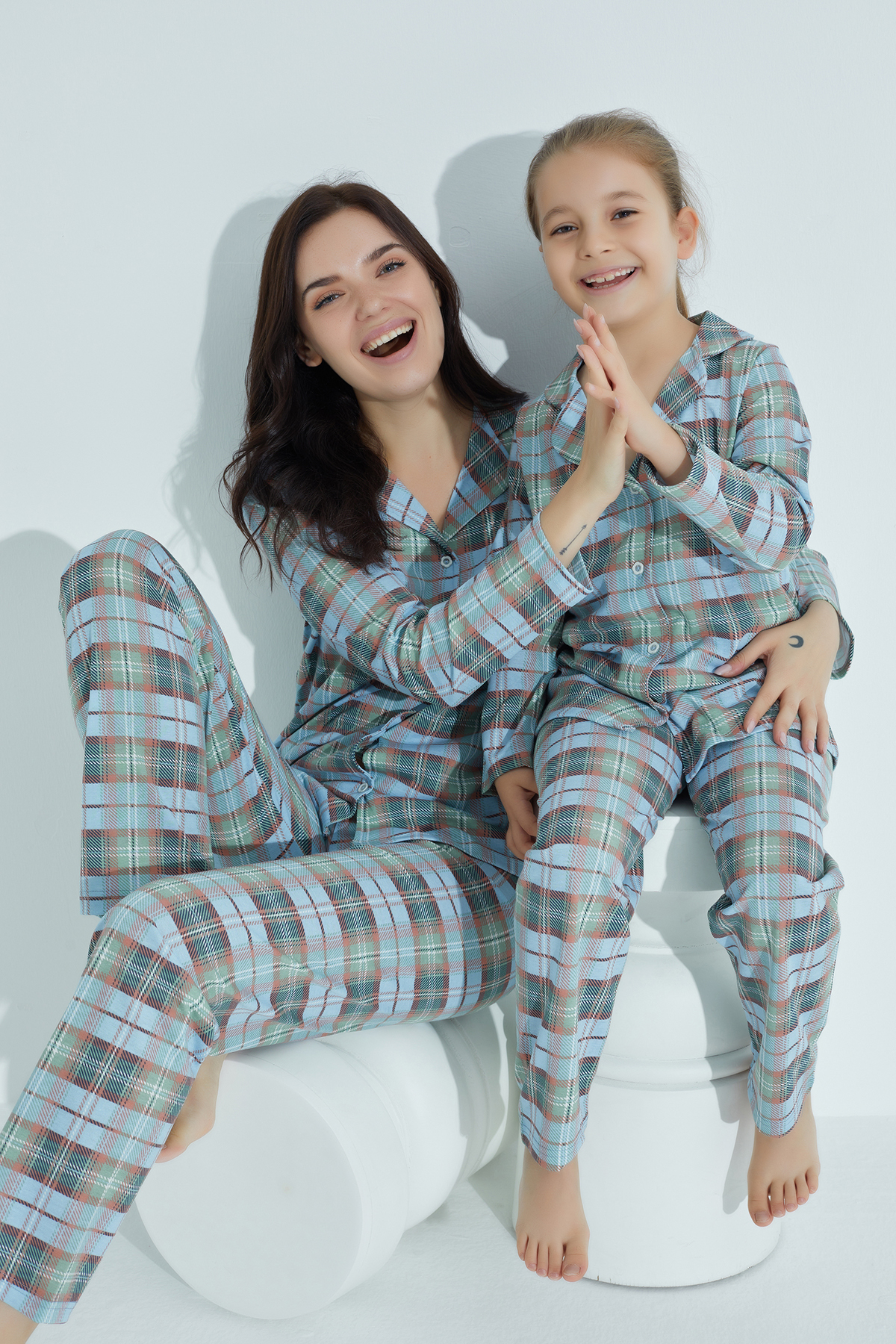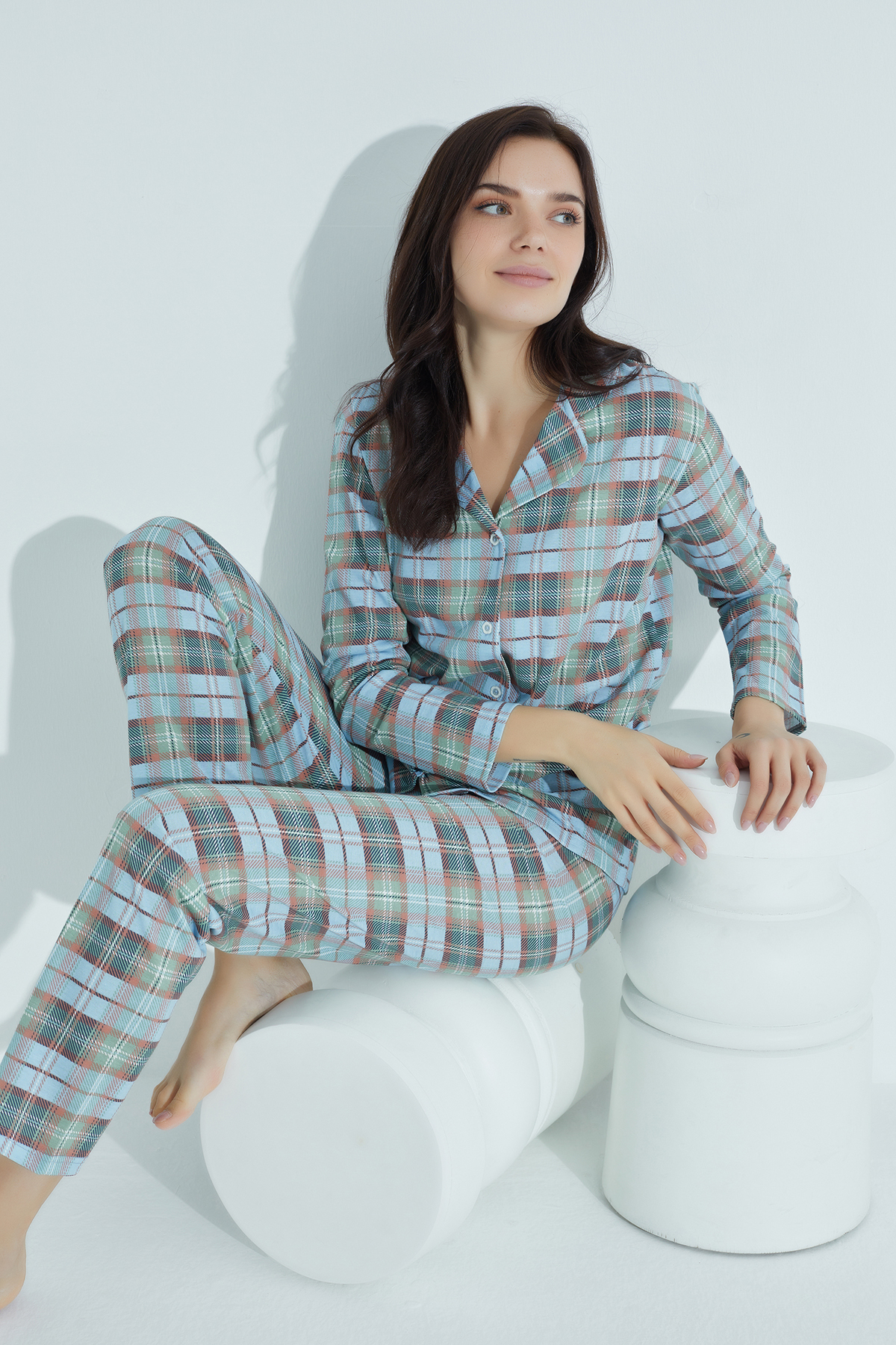لباس خواب دکمه دار نخی Strawberry آبی کمرنگ چهارخانه