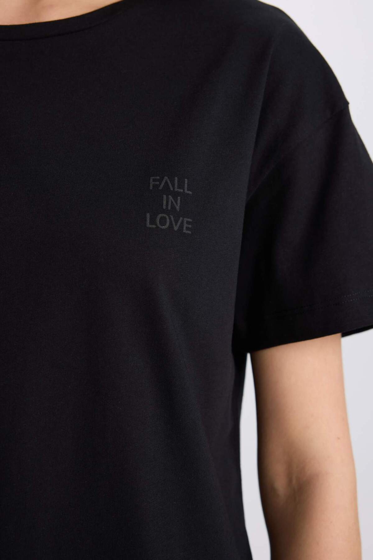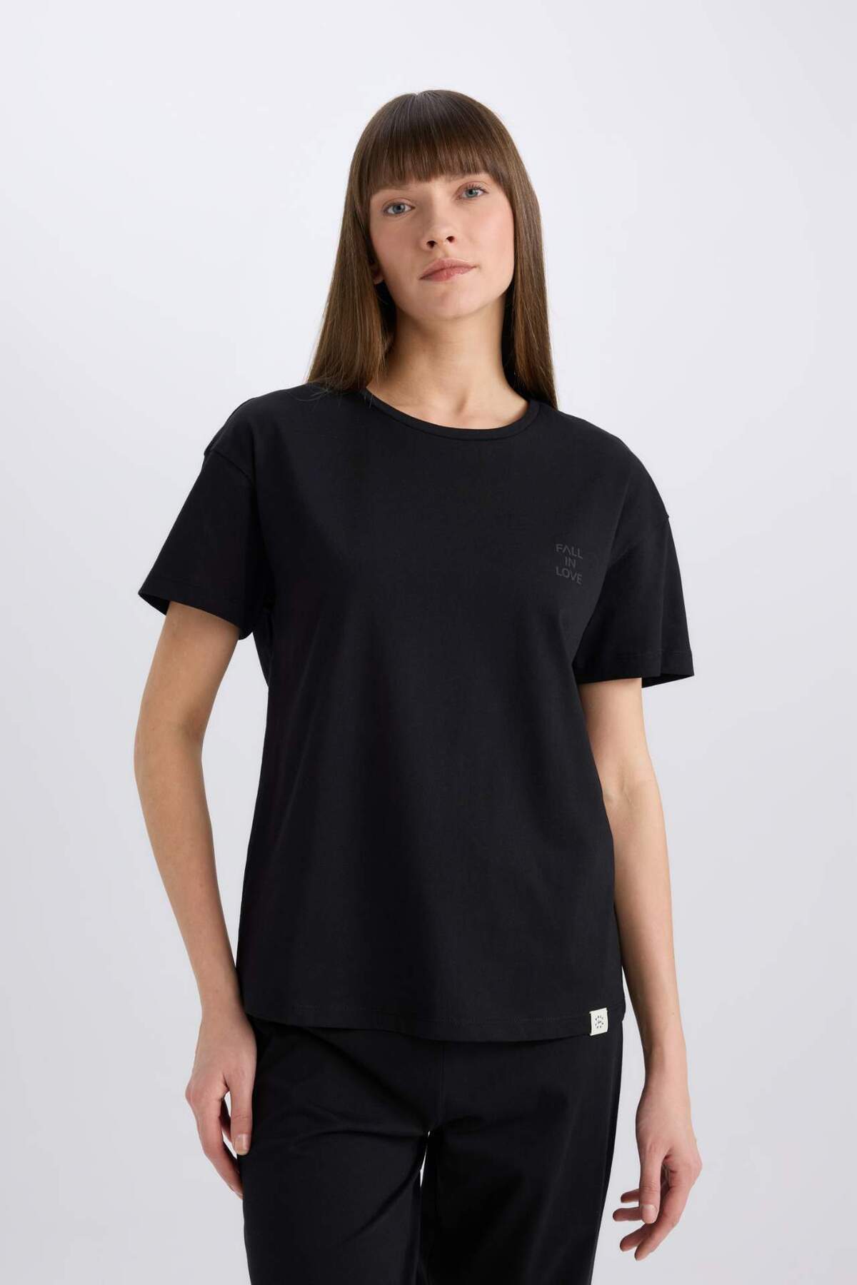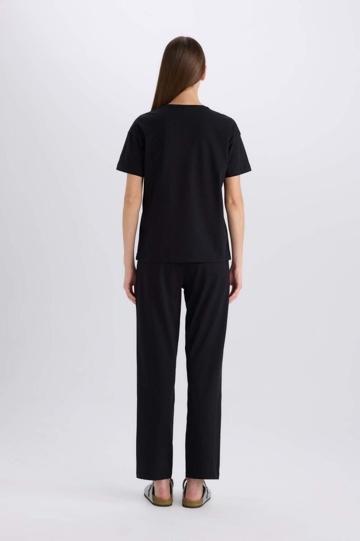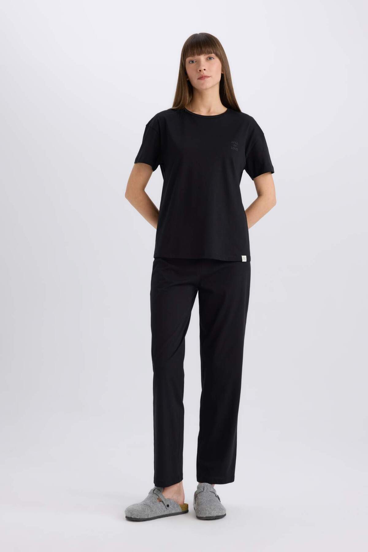 ست لباس خواب یقه گرد آستین کوتاه، شلوار کمر کشی مشکی Defacto