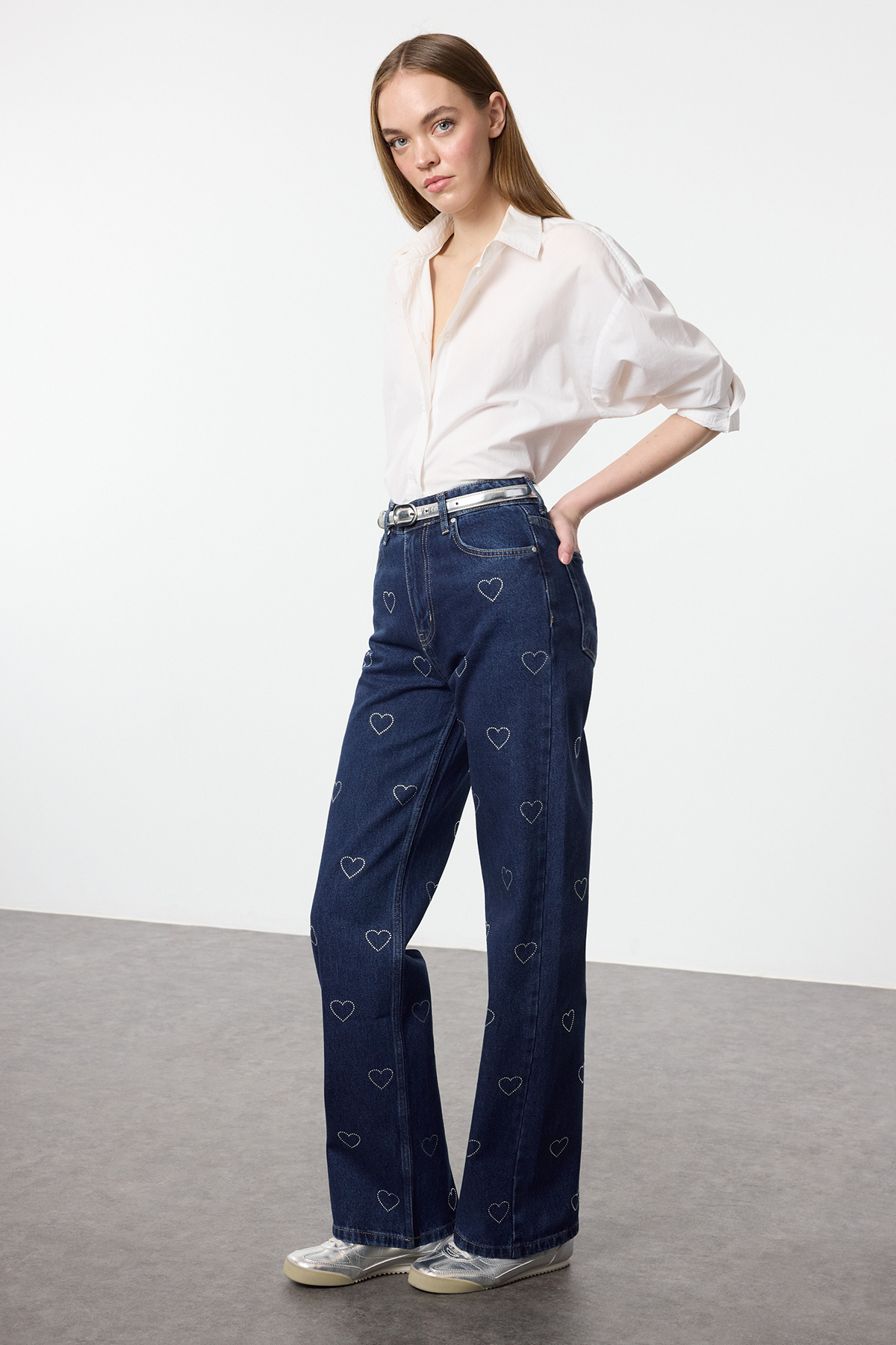 شلوار جین زنانه گشاد با چاپ قلب آبی تیره TRENDYOLMILLA