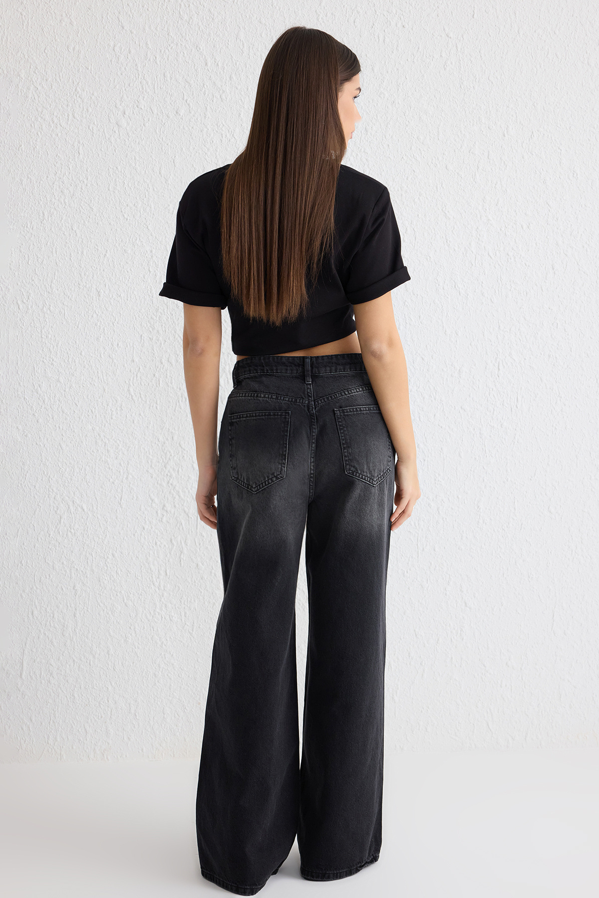 شلوار زنانه جین پالازو قد بلند مشکی TRENDYOLMILLA