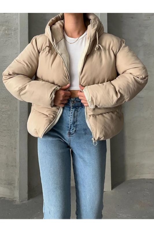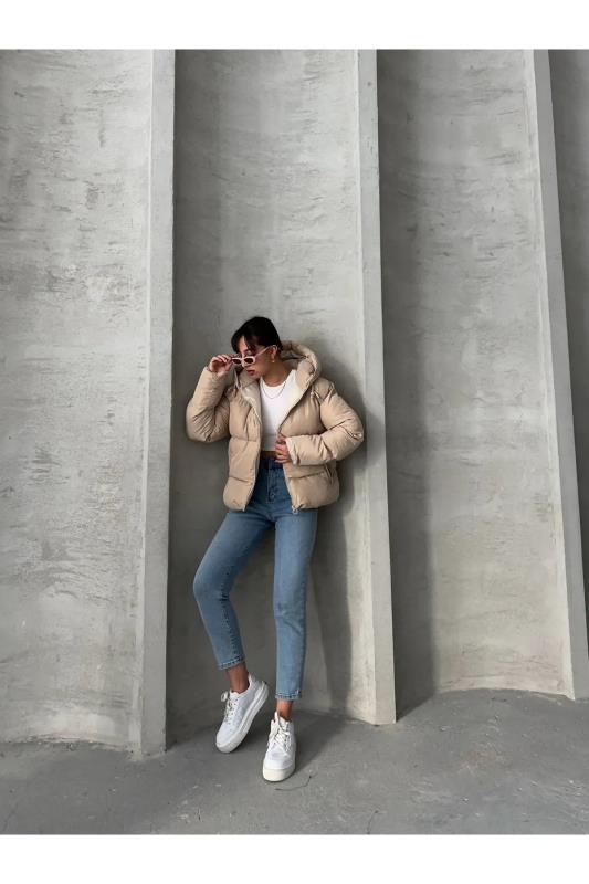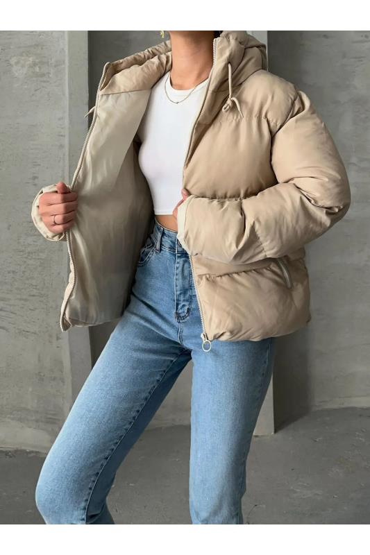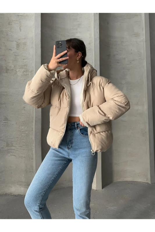 کتپشن پفی زنانه کلاه دار بژ happiness istanbul