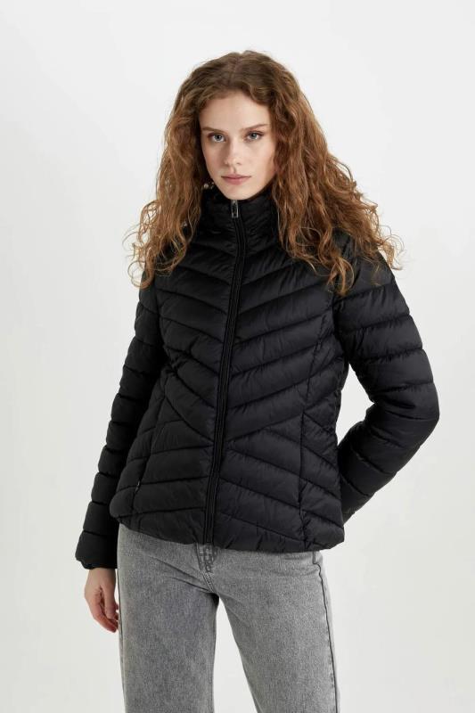کاپشن زنانه پف دار یقه ای ضد آب Relax Fit Stand مشکی Defacto