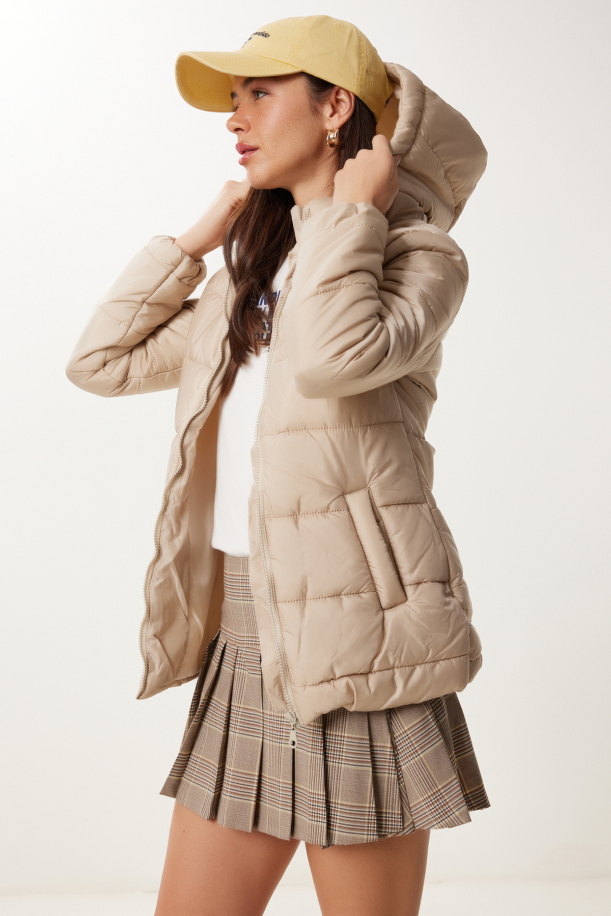 کاپشن پفی زنانه کلاه دار کرم تیره happiness istanbul