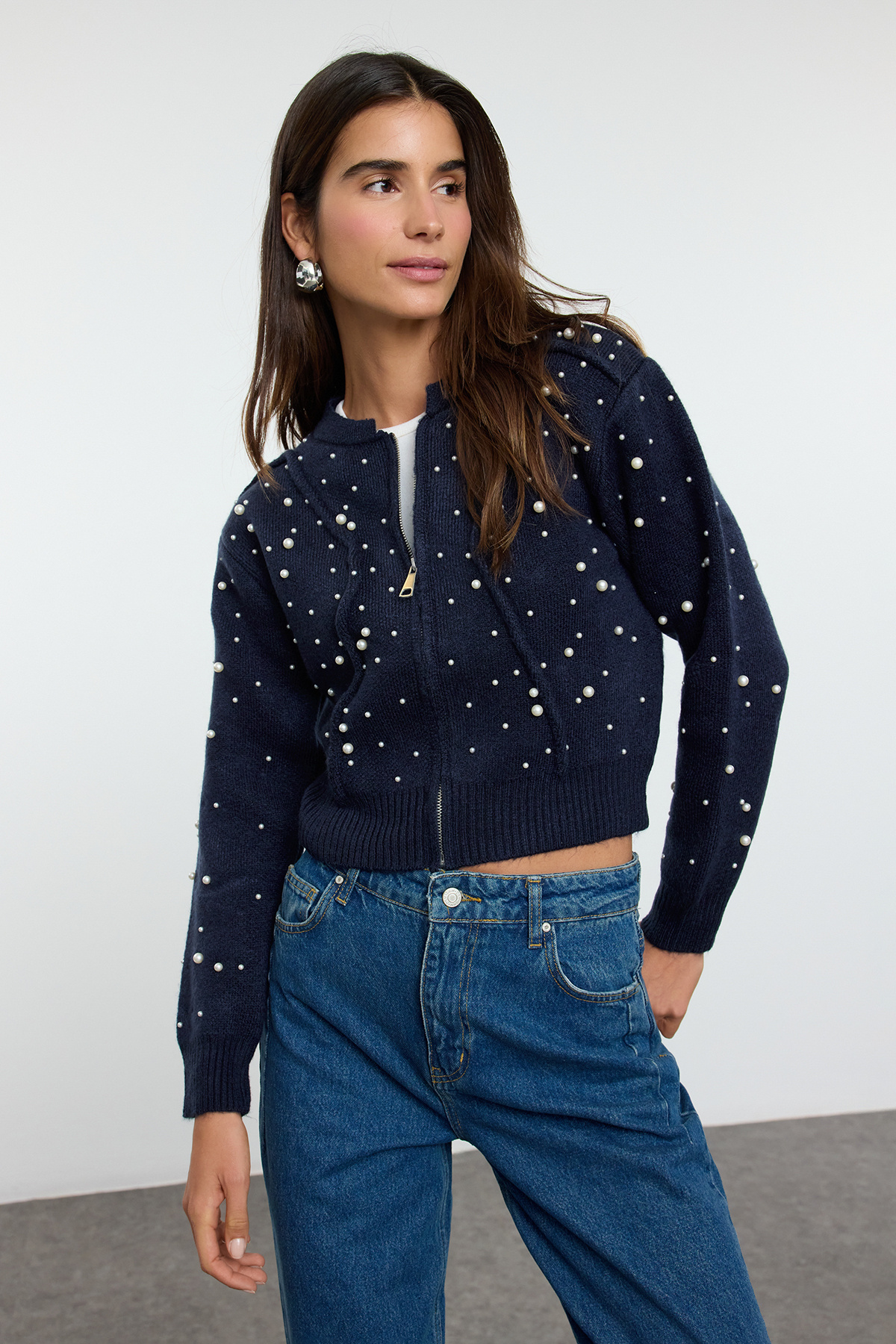 ژاکت زنانه بافتنی، زیپدار، سنگدوزی شده سورمهای trendyolmilla