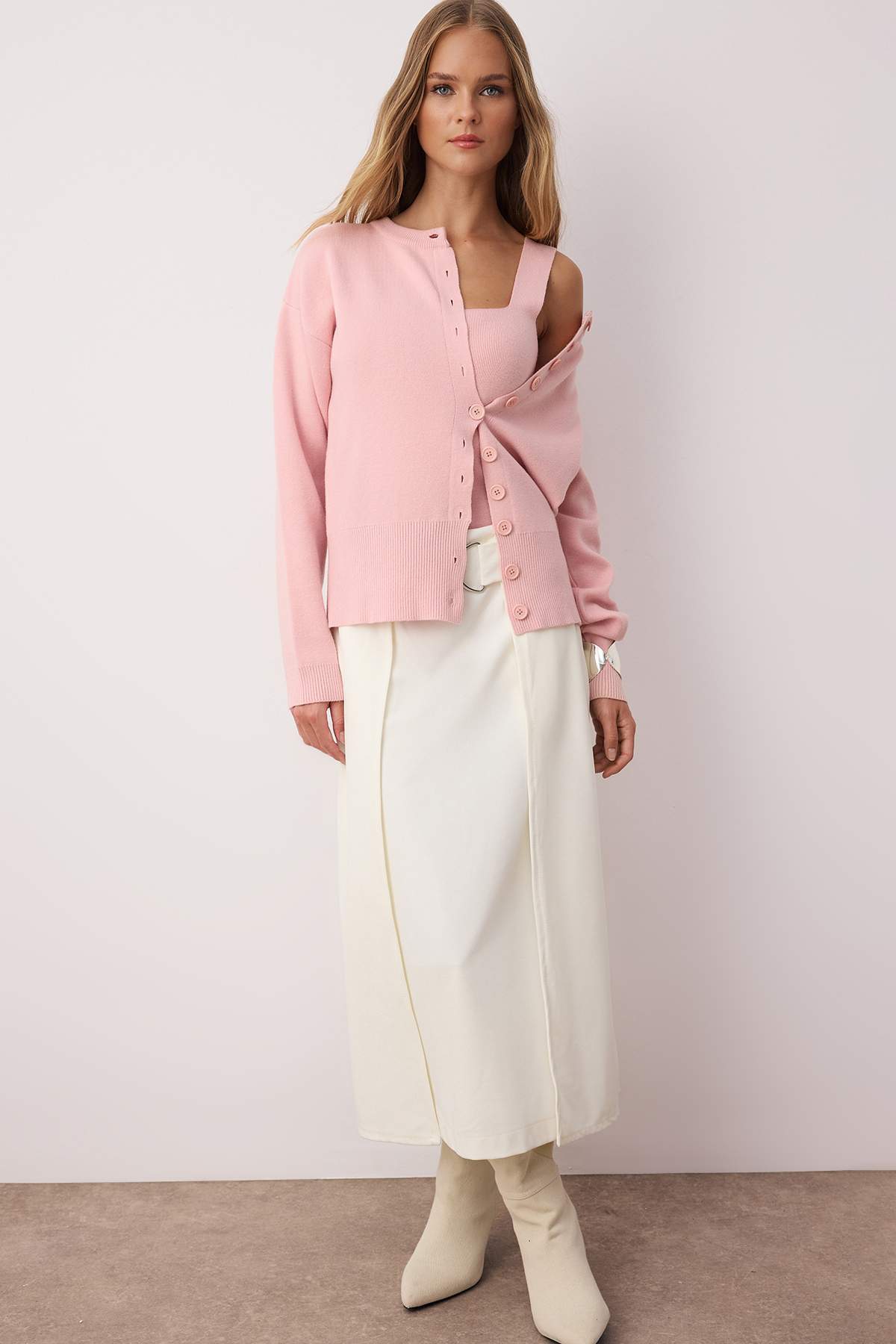 ست ژاکت و بلوز بافتنی زنانه یقه گرد ساده صورتی trendyolmilla