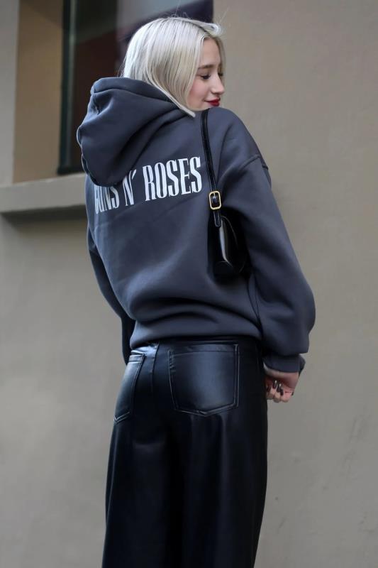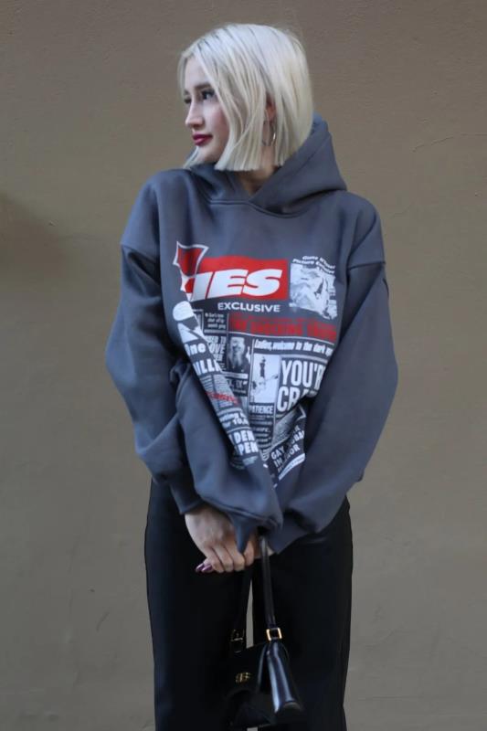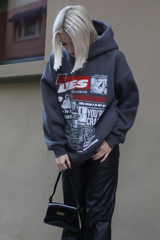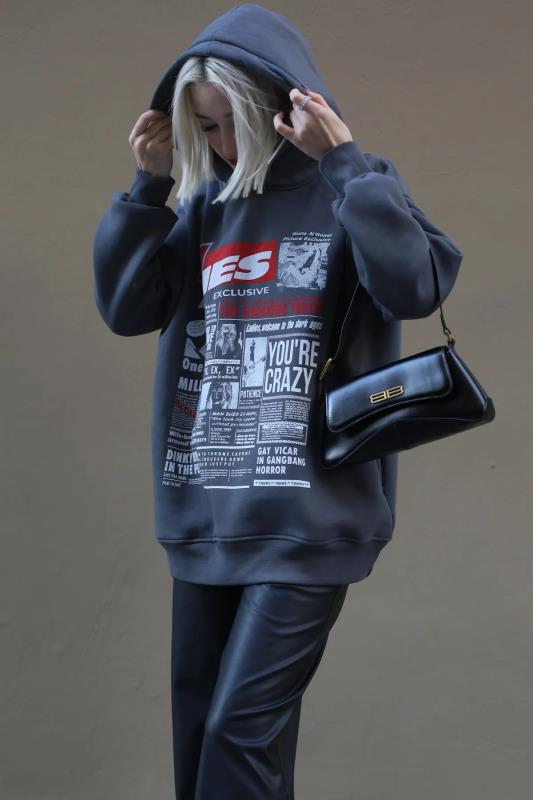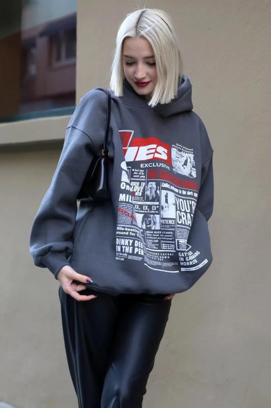 سویشرت زنانه کلاهدار با چاپ Madmext خاکستری تیره