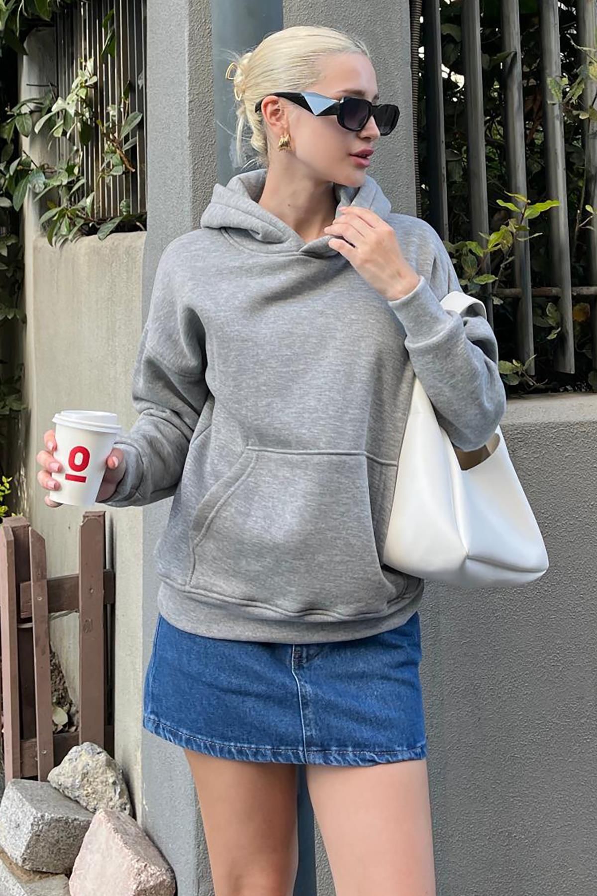 هودی زنانه ضخیم LCW Vision Oversize خاکستری