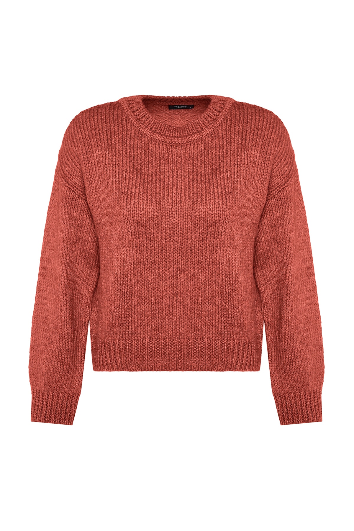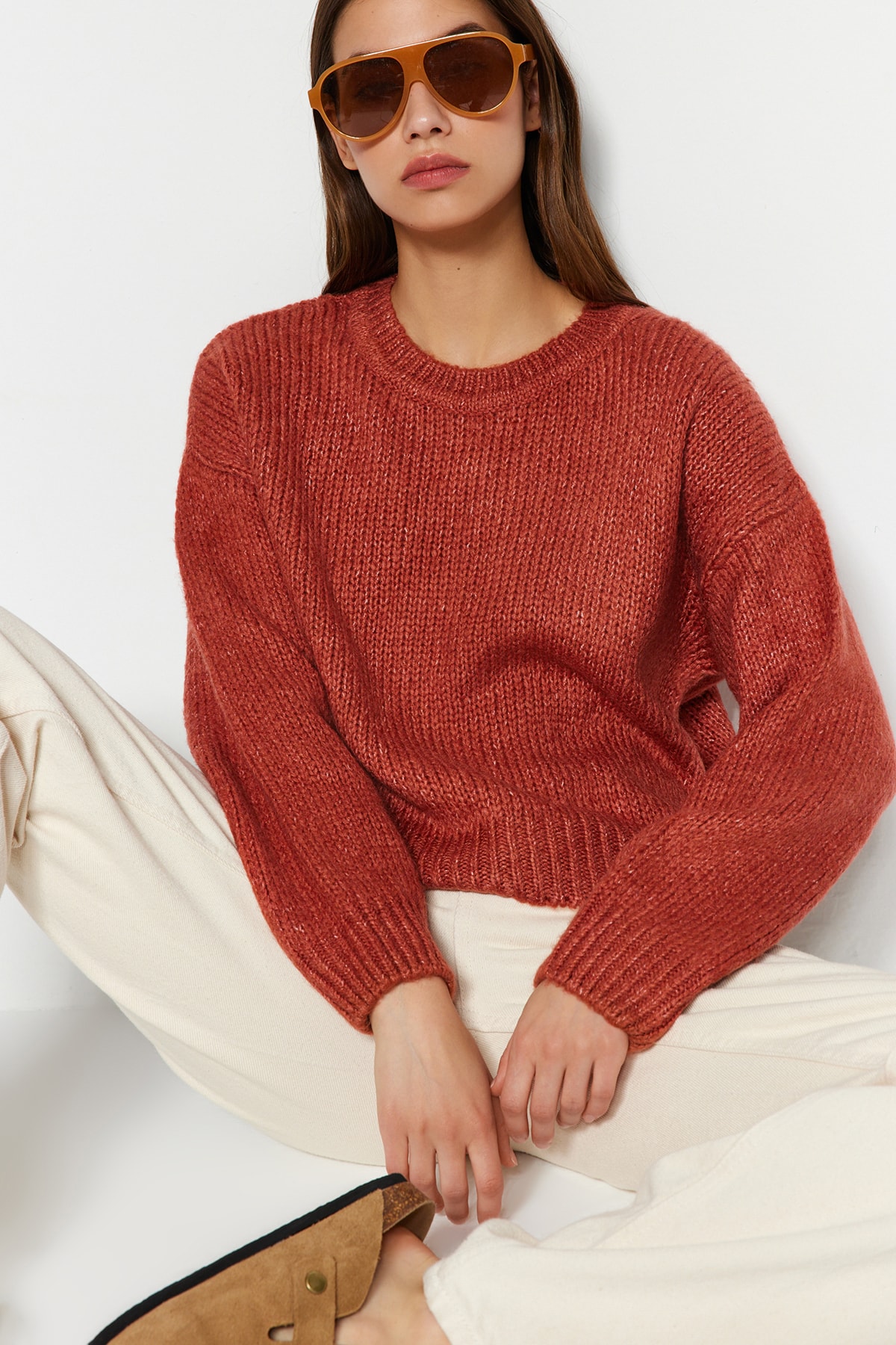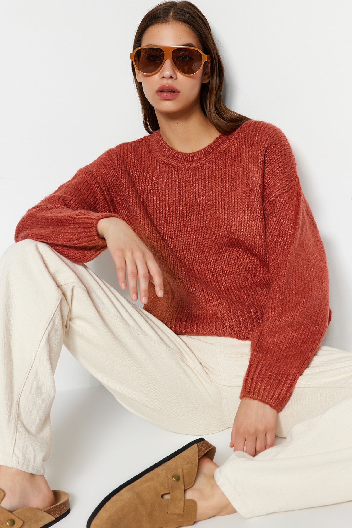پلیور زنانه بافتنی ساده با برش پهن و بافت نرم دارچینی